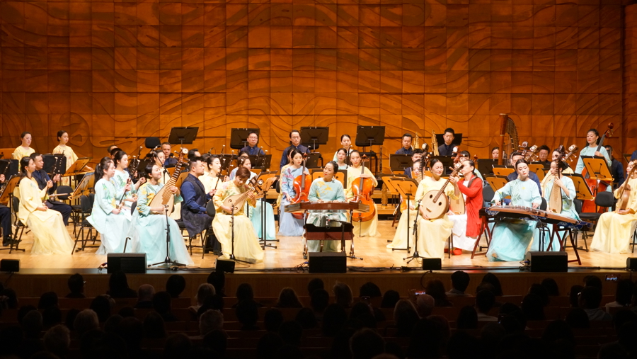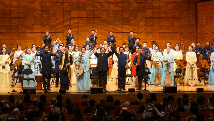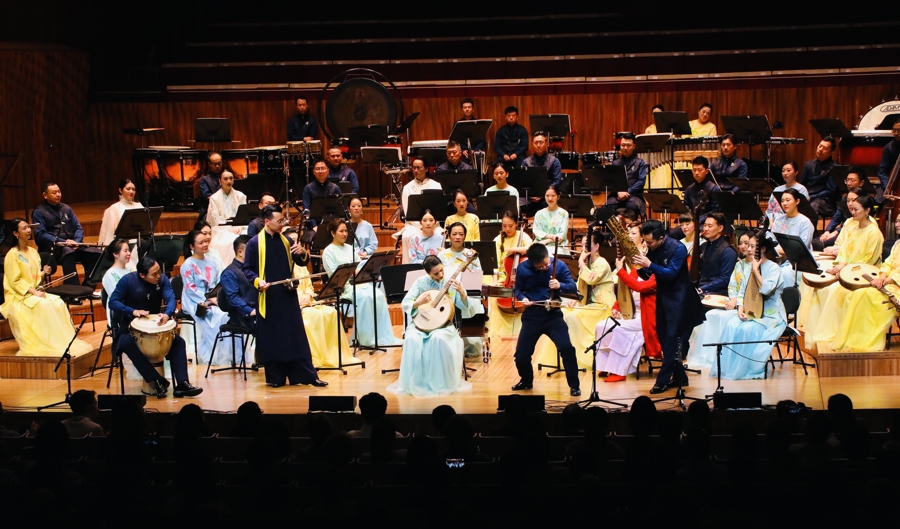 演出以竹笛与乐队《湖光》开篇,清越悠远的旋律如湖面晨雾渐散,勾勒出东方美学意境,为整场音乐会奠定典雅基调;筝与乐队《墨戏》将书法艺术中的虚实疏密转化为音律起伏,在节奏张弛间诠释中国文人的写意精神,实现“音”与“墨”的跨界呼应;琵琶与京胡《楚汉》融合古曲《霸王卸甲》与《夜深沉》,通过重新编配,以宏大乐队语言再现历史英雄气魄,形成跨越时代的音乐叙事;二胡协奏《卧虎藏龙》兼具深情抒情与强烈戏剧张力,既演绎江湖侠义的精神内核,也展现中国当代音乐“抒情与戏剧并重”的创作语汇。