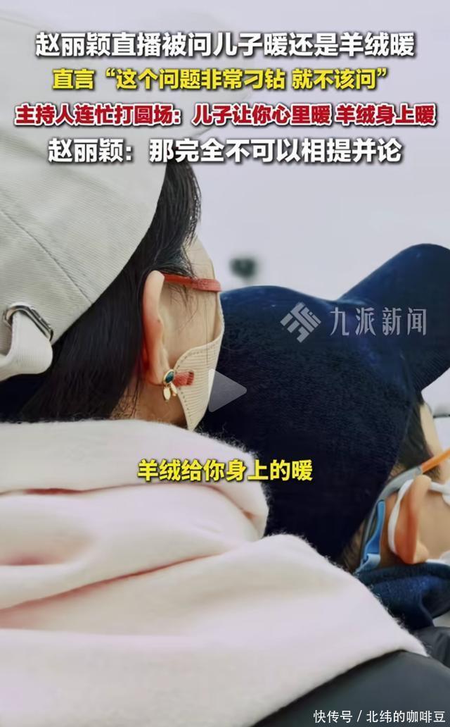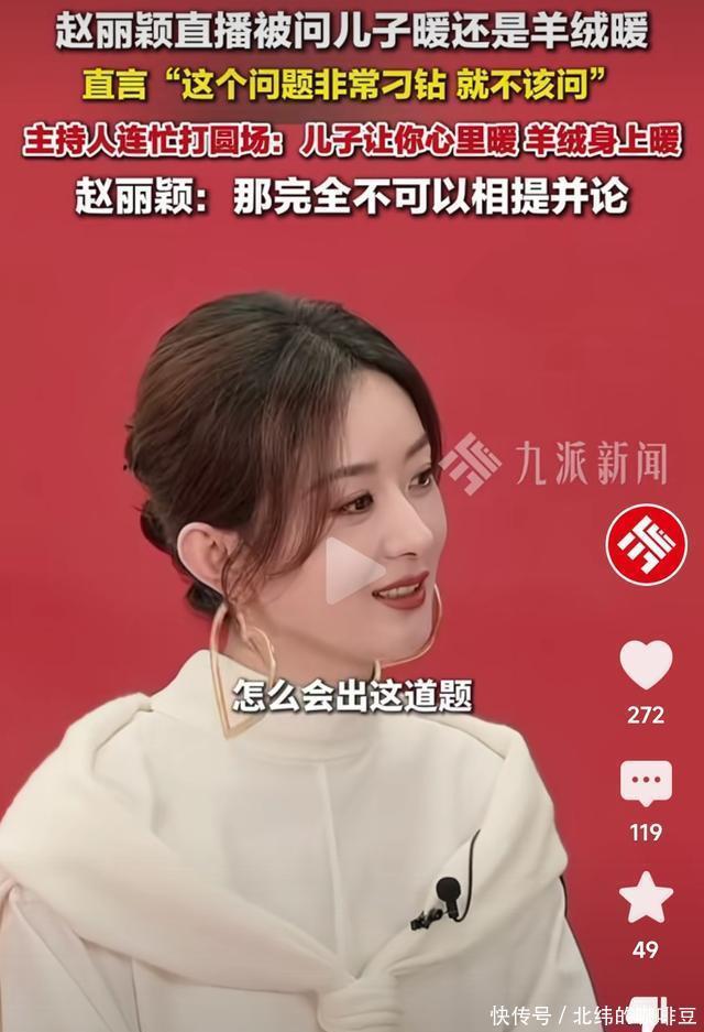 场面一度变得十分尴尬,这位男主持人只能,尴尬的扶一扶眼镜,来缓解此刻的心虚。 赵丽颖当天的打扮,十分的时尚。 穿着纯白色的卫衣,耳朵上挂着一个超大的心型耳环,画着精致的妆容,虽然赵丽颖今年已经快38岁了,但是在争奇斗艳的娱乐圈里,颜值依旧能打。 这场直播里引起了很多网友的热议。 有的人认为赵丽颖太过斤斤计较是拆台,有的人则认为主持人过分挖坑。 有的网友认为,赵丽颖作为品牌方请来的明星,主持人更应该照顾到嘉宾的情绪,而不是利用语言来挖坑,这样做的后果,真的是很不地道。 有的网友认为,赵丽颖虽然角色演的好,但是在现实生活中的情商确实不是很高,人家主持人又没有刺探隐私,只是幽默的cue一下产品,人家说了儿子心里暖好牛,羊绒身上暖,她完全可以点头即可,却非要拆台,不光搞得自己尴尬,也搞得主持人尴尬。 对于这件事情大家怎么看,不妨在评论区留下您的看法。