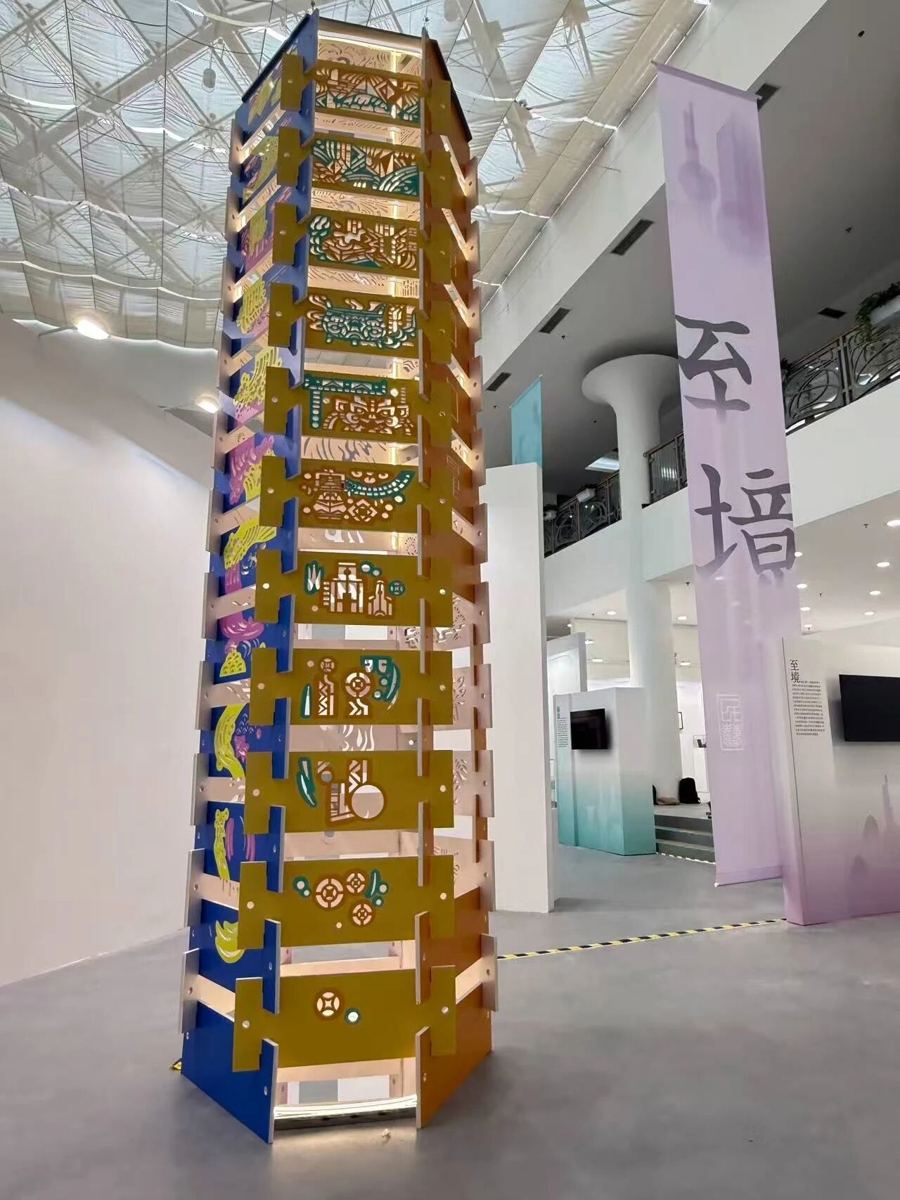 当传统技艺遇上当代设计,当古老非遗碰撞现代科技,会迸发出怎样的火花?展厅中诚利和,一尊由上海市非物质文化遗产项目“海派剪纸艺术”代表性传承人李守白和女儿李诗忆联手打造的大型当代剪纸艺术装置颇为引人关注。它名为《乾坤·东方力量》,是高为4.8米、直径为1.5米的六边形高塔,镂空剪纸立面演绎金、木、水、火、土五行元素,以抽象写意线条重构自然意境,采用新中式撞色理念,交织柔和的光影照射。装置全部以榫卯卡槽拼接,顶部与底座通过镜面构成无限反射系统,观众探入时可见内部白色五行画面镜像重复和无限延伸。