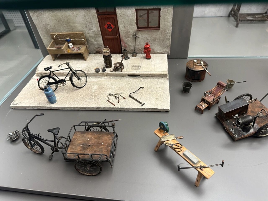 与《乾坤·东方力量》《锦绣中华非遗梦天》不同,“吴淞工匠”赵培艺的《老街一景》则将人们带入微缩的世界。用指尖才能捏住的迷你版煤球炉,居然真的能燃烧;等比例缩小了十几倍的自行车,铰链是可以转动的;指甲盖大小的剪刀,也能把纸剪碎……一个个微缩模型,将老上海人使用过的物件和熟悉的生活场景精准复刻,唤醒城市记忆,让人们直呼“一秒回到小辰光”。